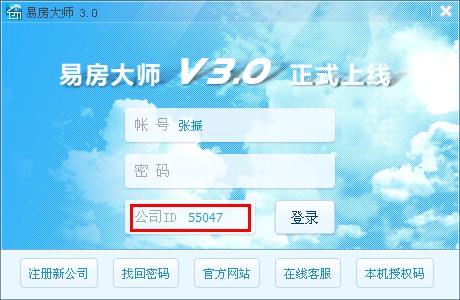 当您退出易房大师,再次登录时,易房大师登录页面会记住您的管理员帐号,并且后台会为您自动分配填写公司ID,请务必牢记!