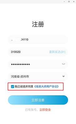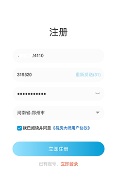 注册手机易房大师管理系统需要使用账号密码登录才能使用。点击易房大师账号登录界面中的立即注册,打开易房大师账号注册界面;